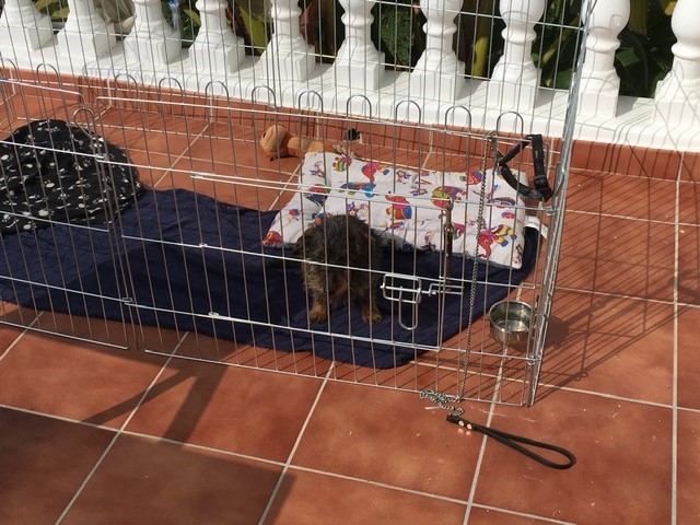 Toen we terug kwamen van de boodschappen, was het pikkedonker, het had langer geduurd dan we ingeschat hadden. Reinout kon de deuren en hekken niet open krijgen uit de keus van bos van 9 sleutels. Ylva lag nog buiten op terras in bench in de ren, Whoopi binnen op slot in bench en ze hadden nog geen eten gehad. Er zijn wel buitenlichten, maar ja, net aangekomen en wie denkt hier nu aan. Alle ramen en deuren zijn betralied en met hangsloten. We hadden niet zo hoeven stressen, want de hondjes lagen rustig te slapen.