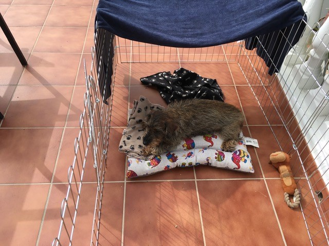 Elke keer als Reinout er maar naar keek, rende ze naar haar bench en duwde haar knuffel diep achter in de bench, zó komisch. Pas na een paar dagen kwam het ervan om overdag het traliehek helemaal te openen.