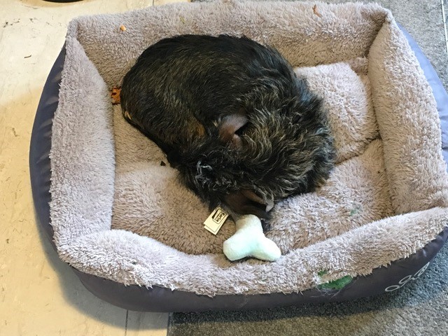 Reinout had Whoopi op schoot en ziet opeens dat het puntje van Whoopi’s staart nu ook kaal is.