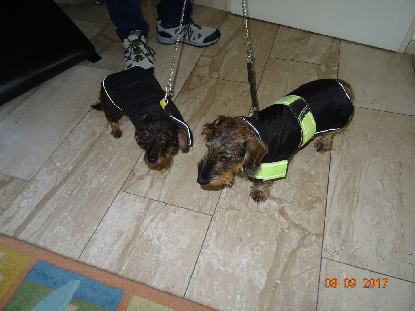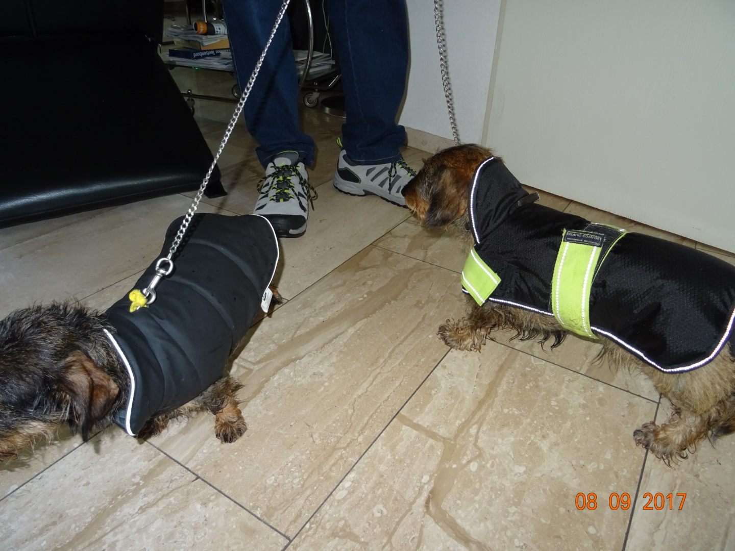 Vannacht en vanmorgen heeft het gestortregend. Omdat Whoopi’s vacht zo lang nat blijft moest ze een jas aan. Ylva kon natuurlijk niet achterblijven.
