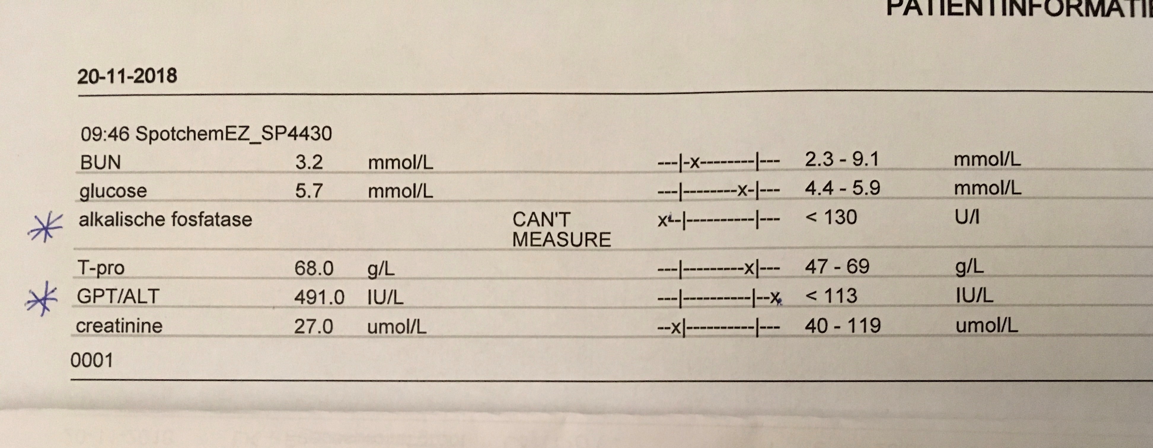 Het is weer erger mis met haar leverwaarden. De dierenarts gaat nu navraag doen, want hij vraagt zich ook af wat er aan de hand kan zijn. De concentratie alkalische fosfatase viel zelfs buiten het meetbereik van het meetapparaat. Uitleg over bloedwaardemetingen is hier en hier te vinden.