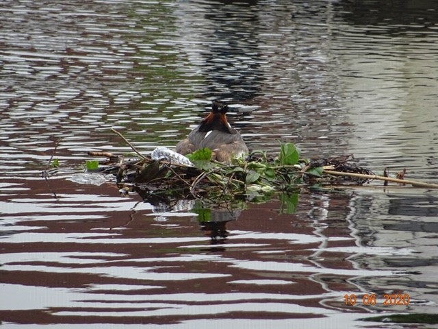 Omdat we het niet aan kunnen zien, zorgen we voor aanbod van takjes, twijgjes, alles wat drijft en ook iets grotere takjes met blad worden naar het nest gesleept, dus is de bovenkant nu min of meer groen.