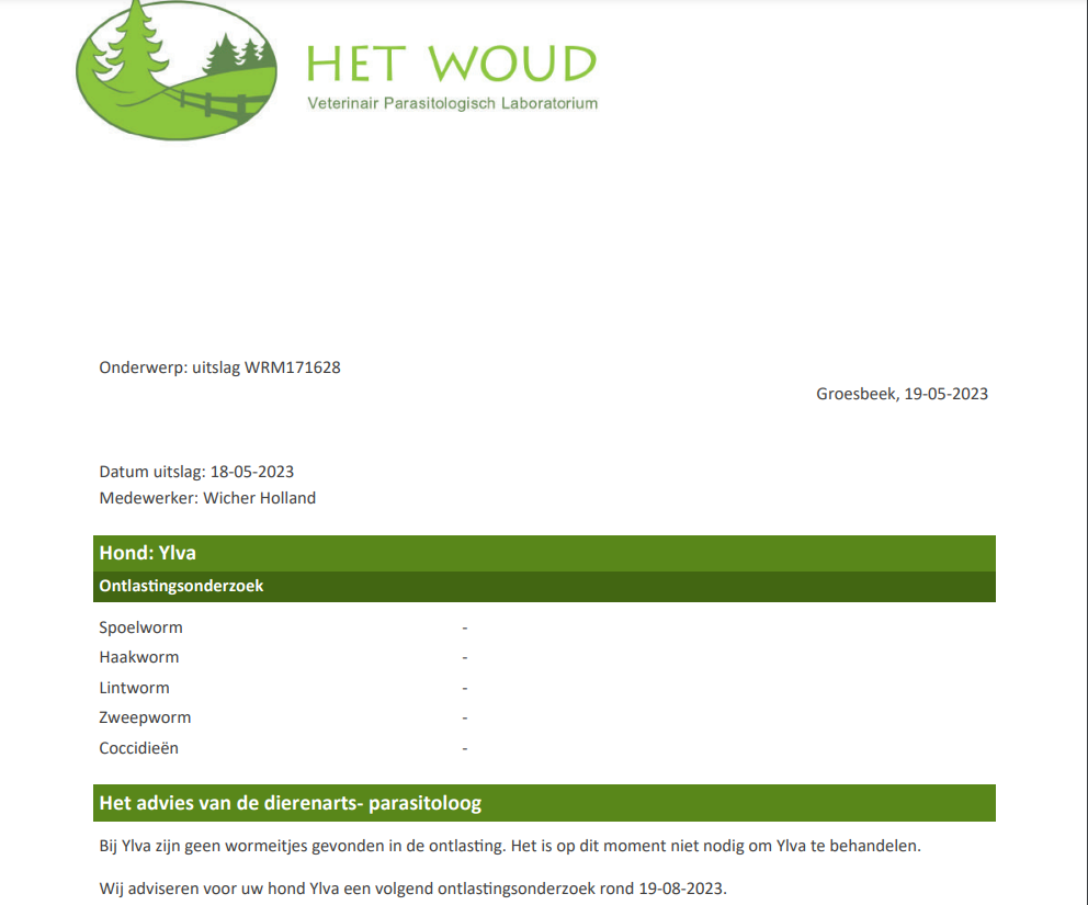 De uitslag is binnen van het ontlastingsonderzoek (mooi woord voor poeptest) van Ylva. Woensdag een drolletje goed verpakt gepost, niet aan Hemelvaart gedacht,