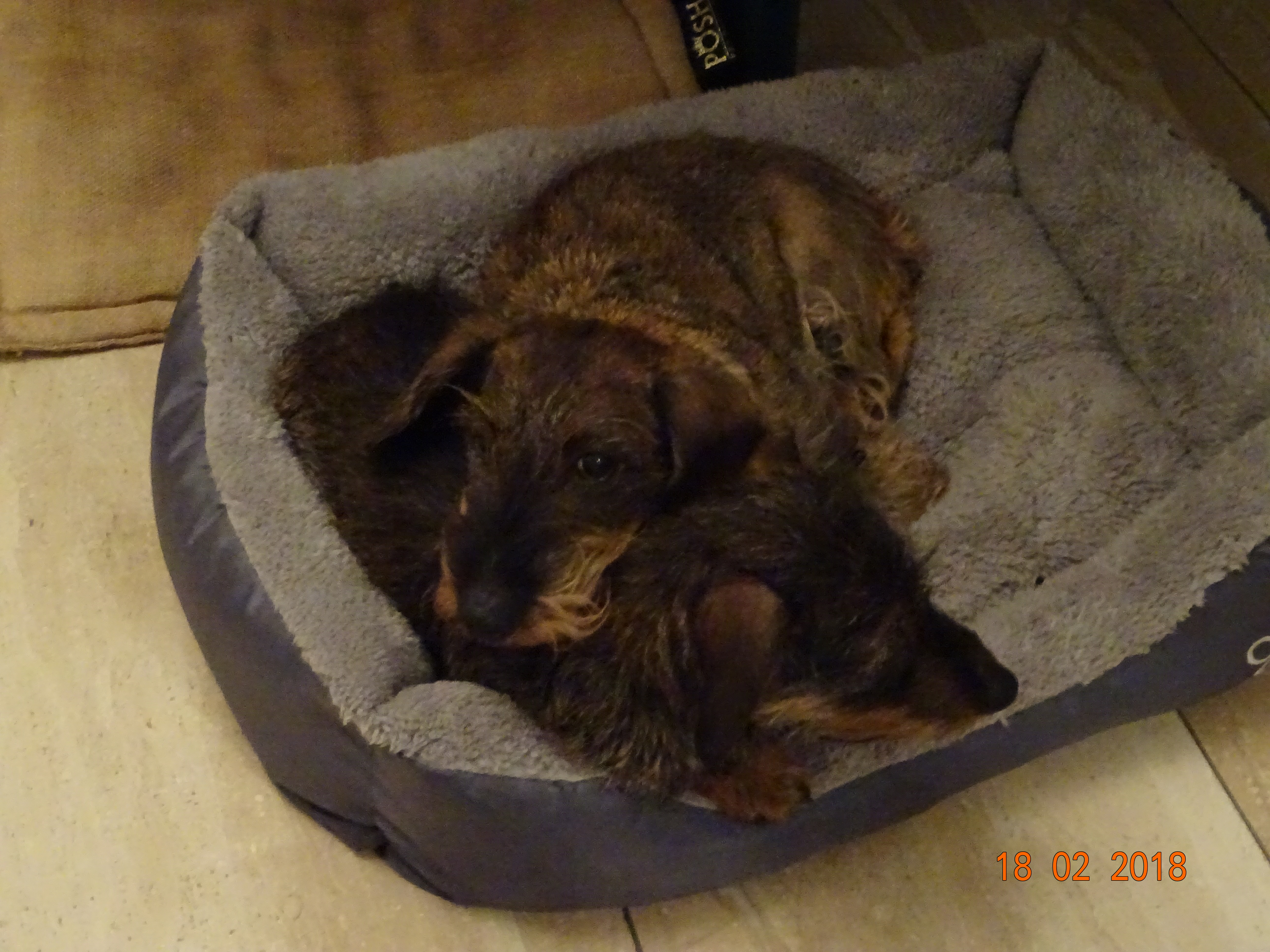 Dat onze beide hondjes in één bedje liggen zien we dagelijks wel, maar altijd gaat het initiatief uit van Ylva, die graag bij Whoopi ligt. Meestal ontaardt dat in gemopper van Whoopi en geplaag van Ylva. Whoopi is niet tegen Ylva opgewassen. Dat begon als puppy, dan keek ze ons angstig aan. Zo gauw ze durft loopt ze weg.