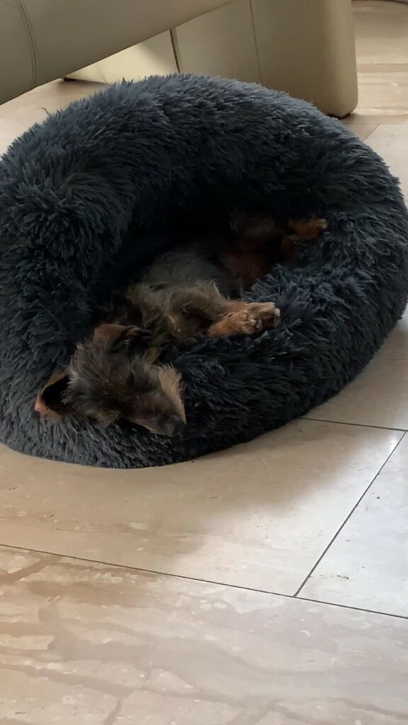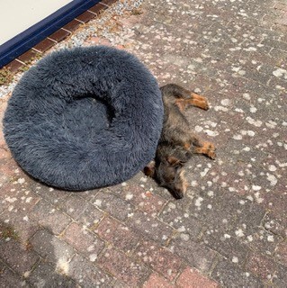 Voor ‘s nachts kreeg ze het reserve bed, voordeel: geen schutkleur, nadeel: ik vind het een bordeelbedje, maar ach, we raken ook hier aan gewend en gaan uiteindelijk wel over op de echte Donutbedjes. Die blijven tenminste plat liggen.
