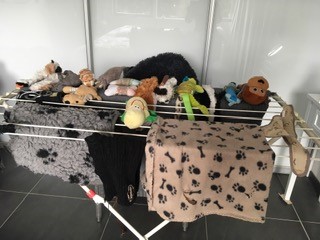 Vandaag hebben we drie flinke bewaarkratten met speelgoed, kammen, riempjes etc.etc. nagekeken en waar nodig gewassen.