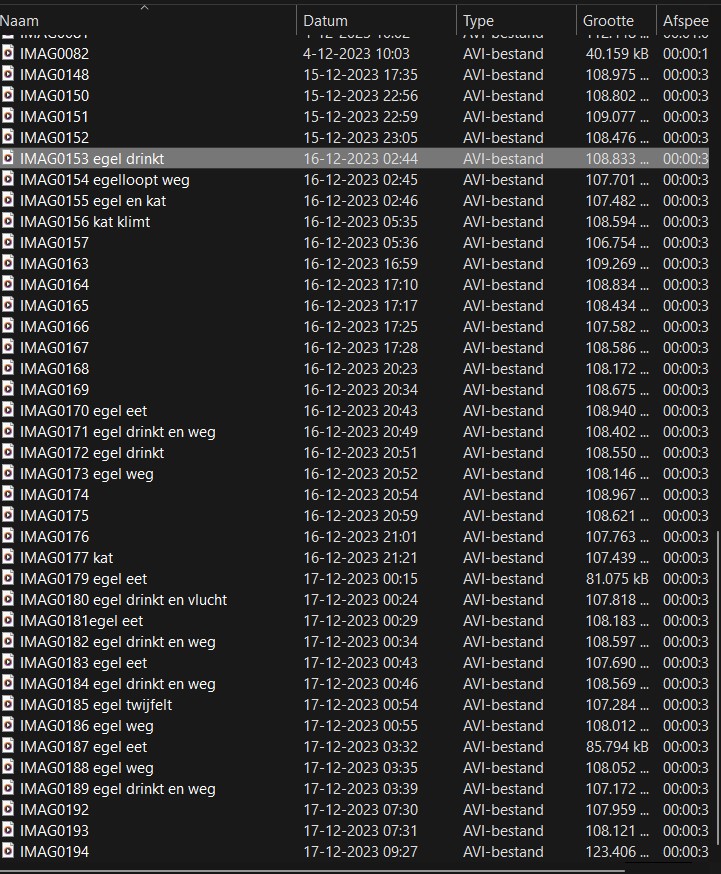 In onderstaande listing van fragmenten heb ik een paar kort benoemd. Let op de tijden, het kan even duren voordat het volgende fragment begint. Maar een aantal keren komt de reeks “egel eet > egel drinkt > egel weg” voor. Het is niet helemaal zeker of ze zo bij elkaar horen, maar dat lijkt mij wel.