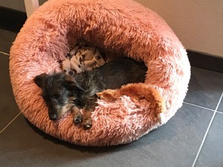 Ons teckeltje Ylva met nieuw speeltje.