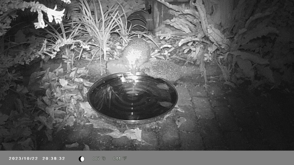 Eerder vertelden we al over egels in onze tuin. Afgelopen nachten de wildcamera weer aangezet, een nacht met opdracht “foto” en een nacht met opdracht “video, 20 sec.” Beide nachten waren er opnamen met egels, sommige met twee egels tegelijk. Maar er waren ook andere bezoekers. Katten hadden we al eerder gezien, maar nog geen rat.