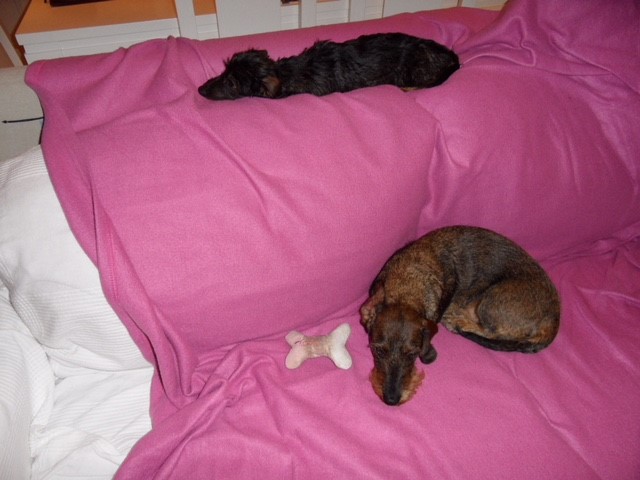 de bank zat beroerd, maar voor de hondjes was het zeer comfortabel. Ylva lag altijd op de leuning, want de kussens waren ingezakt, dus mooi plekje voor haar.