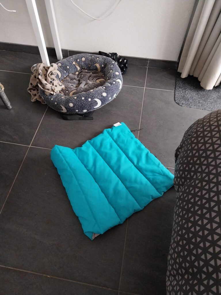 I. een kussen, met vachtje er overheen….daarvandaan kijkt ze op de eettafel met stoelen.