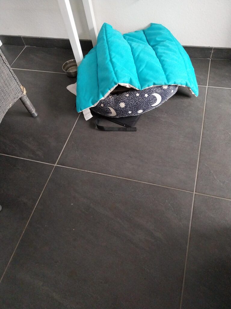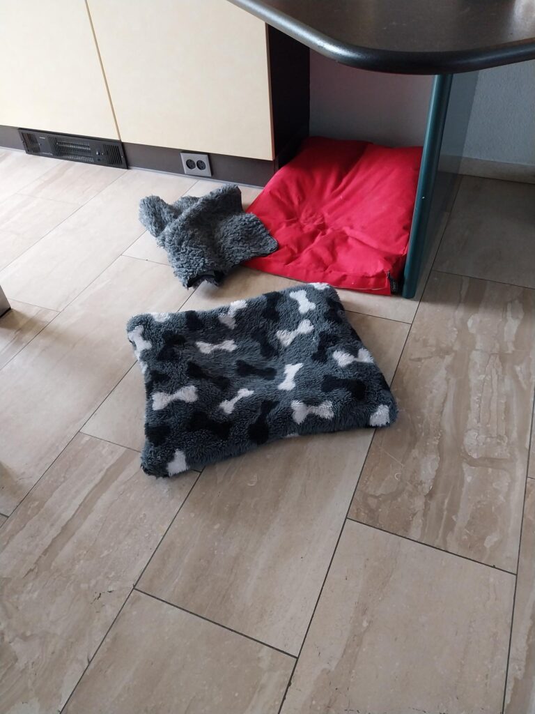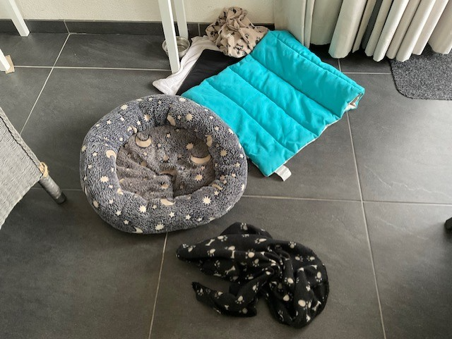 Ylva sleept de laatste tijd veel met haar ligplaatsen. Zowel in de slaapkamer als in de woonkamer haalt ze kussens en kleedjes van hun plaats en sleept ze naar een plaats waar ze flink in de weg liggen.