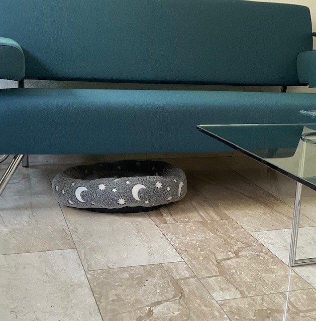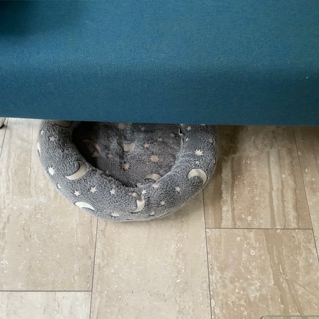 Als we TV kijken of gewoon vóór zitten, dan wil ze op het kussen onder de bank, nou ja dat onder de bank, soms zelfs diep onder de bank, is één van de mogelijkheden.