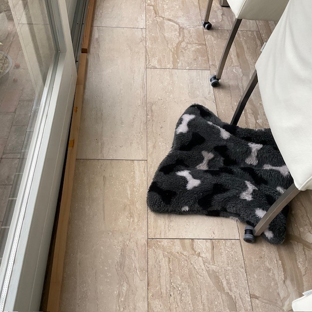 Ylva sleept, krabt, trekt dat vachtje tussen alle stoelpoten door ( 24), om met vachtje naast ons te komen liggen.
