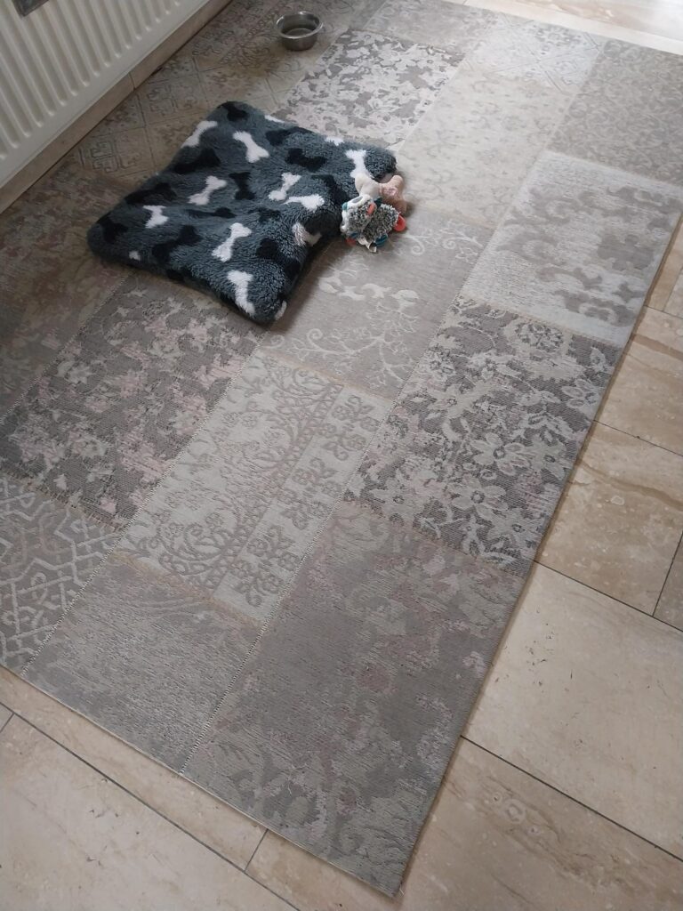 II. Op een kleed in de kamer, speciaal voor onze hondjes gekocht, staat haar bakje water en er liggen een paar knuffels en…haar vachtje