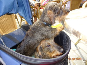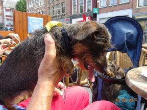 vandaag was het mooi weer, dus met hondjes en buggy de stad in. Natuurlijk gaan we dan ook naar een terras. De hondjes in de buggy, dan kunnen ze alles goed zien en lopen niet (in de) weg. De och’s en aach’s van bediening en andere gasten waren niet van de lucht, totdat…. Ylva duiven ontdekte en luidruchtig werd. Wij moesten voortijdig het terras verlaten om geen stoorzender meer te zijn.