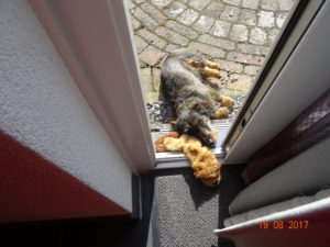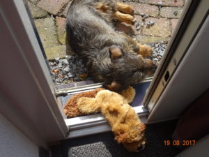 Het is opvallend: elke keer als we van huis zijn is lijkt Ylva veel verdraagzamer naar de meeste honden. Het moet niet iemand op een fiets zijn met een zwarte hond naast zich, maar veel honden negeert ze en sommige hondjes lijkt ze zelfs leuk te vinden, dit alles zeer tot ons genoegen .