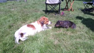 Er kwam een mevrouw met een kooiker ons tegemoet. Natuurlijk houden we dan Ylva, die los liep, extra in de gaten. Zoals we gewend zijn riep deze mevrouw: “hij doet niks”. Dus weer dezelfde discussie: Uw hond misschien niet, maar wij weten niet hoe zij reageert. En ja hoor, Ylva keft, de nog jonge kooiker komt enthousiast op Ylva af, die er gillend van door gaat, We raken aan de praat met de bazin en intussen maken de honden ook voorzichtig kennis. Op het laatst ging het zowaar heel goed, zie foto.