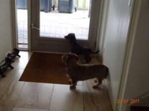 Zo dat is klaar. Met een beetje geluk kunnen we nu naar buiten, maar als ze van opwinding keffen, is het wachten tot ze stil zijn. Dan…voordringen bij de voordeur, èh eerst baasje, dan hond.