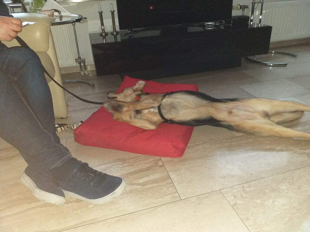 Pojke kwam op bezoek. Eerst even buitenshuis aan elkaar snuffelen, Daarna ging het binnen boven verwachting goed. Juist binnen wil Ylva nog wel eens agressief zijn tegen een andere hond. Toch hebben we ze voor alle zekerheid allebei kort aangelijnd gehouden.