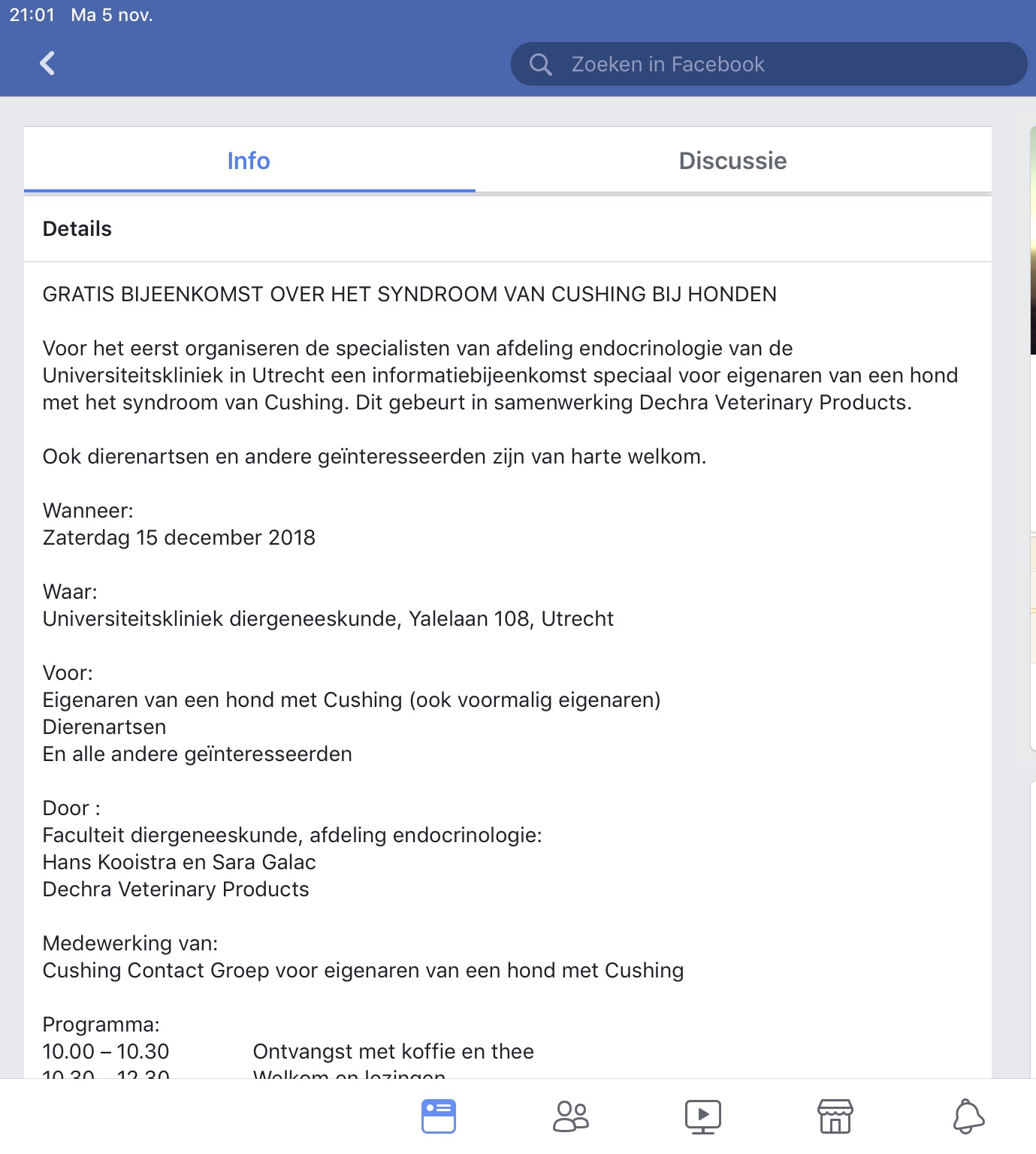 Op 15 december 2018 is er een voorlichtingsdag over Cushing bij honden in de diergeneeskundige faculteit in Utrecht van 10 tot 15 uur. ( wel opgeven). Ook dierenartsen zijn uitgenodigd. Hier een deel van een screenshot van de aankondiging van deze bijeenkomst.