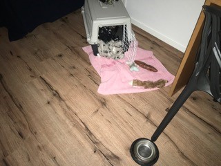 Ze heeft een hele tijd haar benchkussen plus haar fleece dekentjes gemaltraiteerd alles uit de bench, daarna zij in lege bench om te proberen dat kussen weer naar binnen te trekken, wat natuurlijk niet echt lukte.