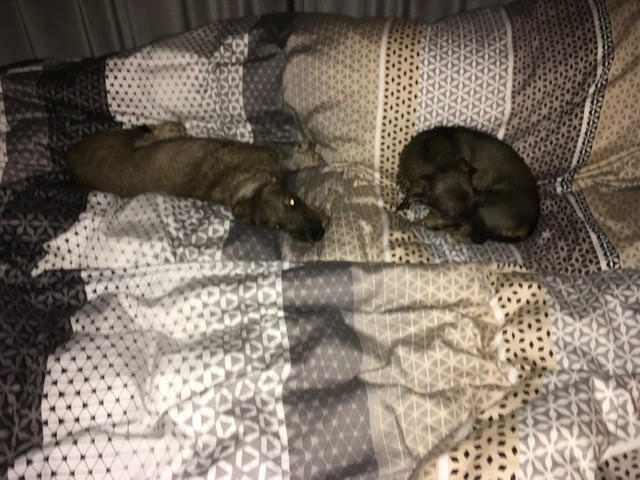 Nu zijn ze moe, hun kauwstaafje op en rust. Wat een dag voor ze die al vroeg begon met de komst van de hulp die dit keer op vrijdag kwam.