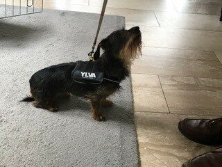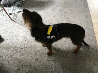 Ylva is samen met baasje wandelen, met nieuwe tuigje, geel lintje natuurlijk en een voor ons heerlijk, maar voor haar minder, luchtje. Zo kan ze buiten uitwaaien.