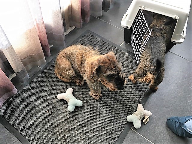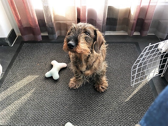 Whoopi zag er vanmorgen weer uit als iemand die net uit bed komt met ongekamd haar. Haar vacht is weer rommelig, het was even wat beter na de laatste plukbeurt, maar nu ligt er weer een pluizig dekje over haar vacht van zo te zien dood haar. Het zit nog wel vast. Na een borstelbeurt lijkt het even netjes, maar haar baardje staat echt alle kanten op. Zo keek ze ons vanmorgen ook aan toen we, verbannen, in de slaapkamer zaten en werkten omdat de hulp in de woonkamer aan het werk was.