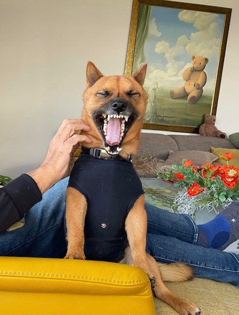 Na een tijd rompertje uitgedaan, maar meteen begon Woody weer te likken en krabben, dus…rompertje weer aan, zie foto’s.