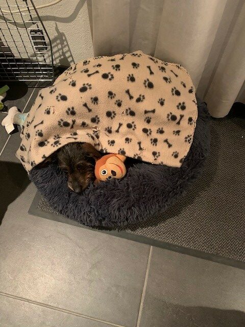 Nadat haar etensbakje leeg was, ( en dan heb ik het over seconden), sjouwt ze weer terug naar haar bedje. Vanmorgen ging het buiten heftig tekeer. Het was nog wel droog, dus moest ze uit. Natuurlijk heeft ze daar geen zin in, maar toch liep ze dapper mee, totdat de eerste druppels vielen.