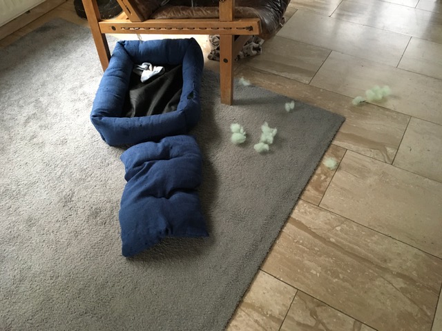 Ylva bijt in haar kussen bij stress, schudt het al grommend heen en weer, alsof ze een prooi te pakken heeft. Dus uiteindelijk zitten er zoveel gaatjes in van haar tandjes dat er een groter gat ontstaat.