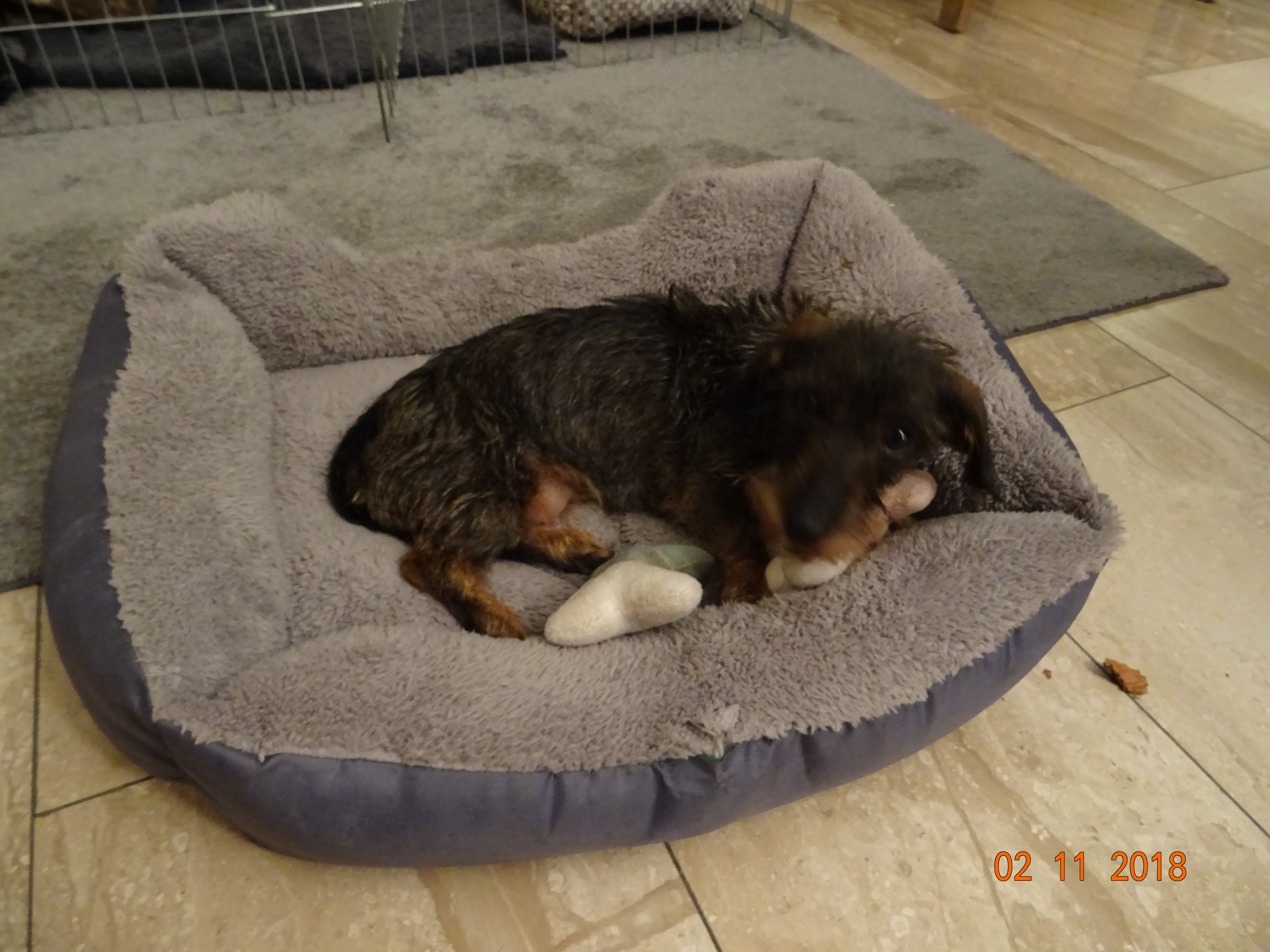 Spelen de hormonen toch nog op? Gisteren jankte ze het nog uit met een knuffel in haar bekje. Ze is ook erg blij als ze ons weer ziet na een (korte) afwezigheid, dan loopt ze te kronkelen en te kwispelen. Vandaag werd ze -per ongeluk uiteraard- op haar pootje getrapt. De gebruikelijke reactie, aanval op Whoopi, bleef zowaar uit. Maar het bedje op de foto moest het wel weer ontgelden toen er op straat een paar honden langs kwamen. De vlokken vlogen in het rond, die zijn teruggestopt en het gat is weer dichtgenaaid. Oh wat was Renate boos op haar.